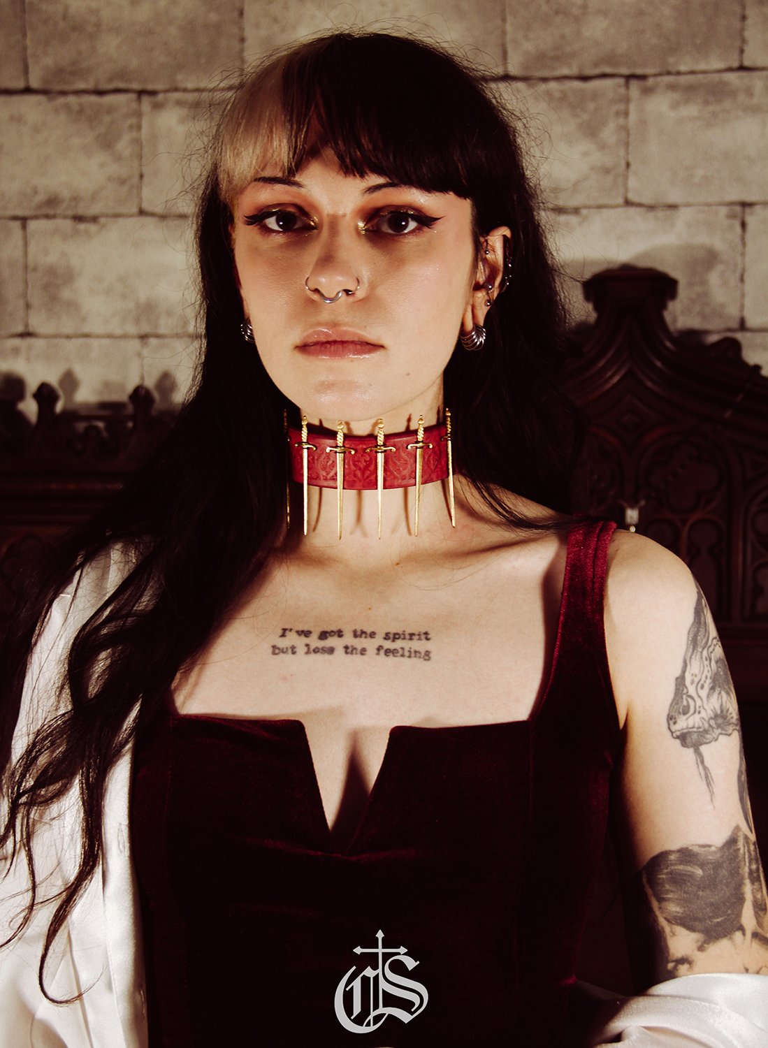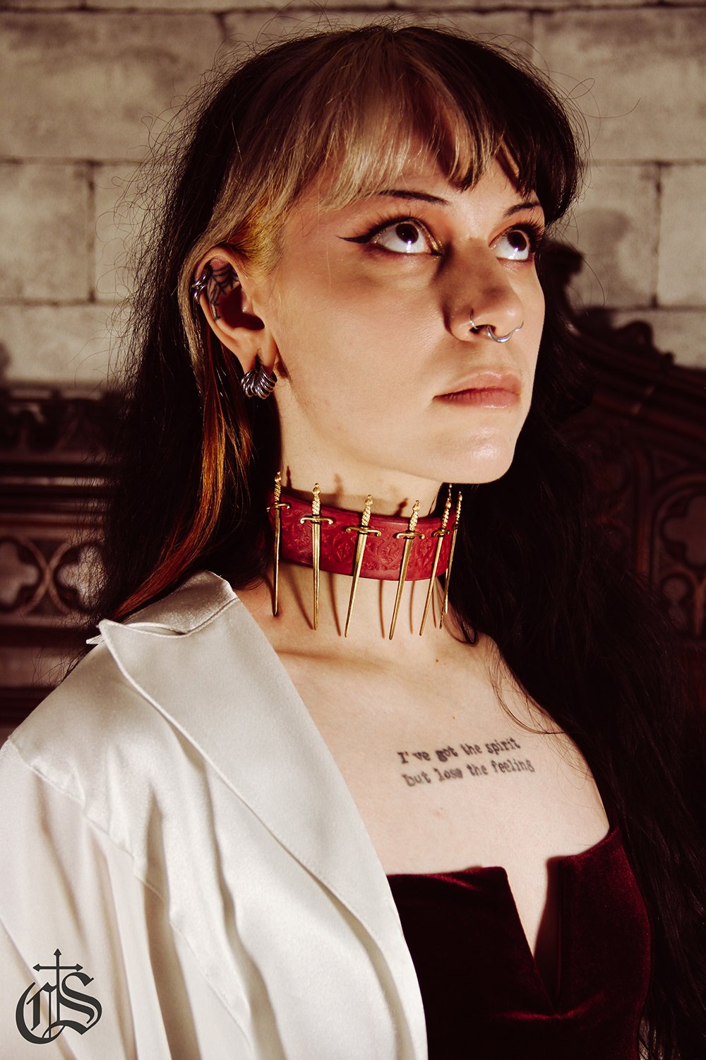 Ce choker orné de 7 épées ou dagues, est une référence à Notre Dame des douleurs, ou Vierge aux sept douleurs ; Mater Dolorosa, souvent représentée avec sept poignards, lesquels représentent les sept douleurs éprouvés par Marie, et relatées dans les évangiles, durant les différentes étapes de la rédemption du Christ jusqu'à sa mort.