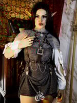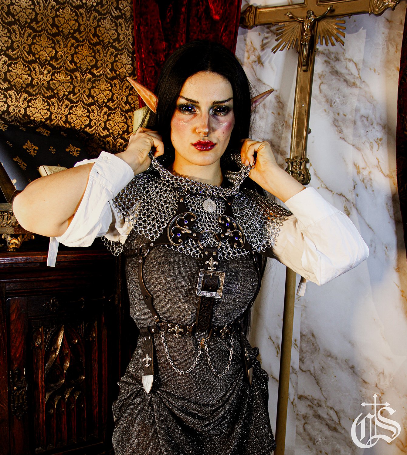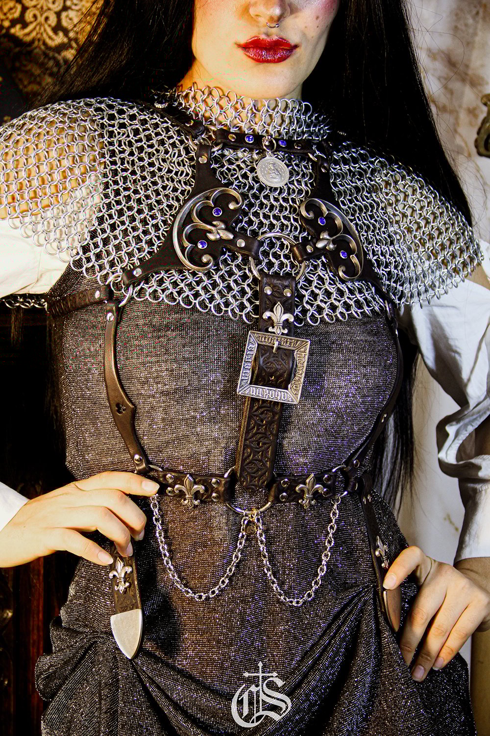 Ce harnais rend hommage à cette figure avec une forme aux attrait d'armure, ornée de fleurs de lys et de verre bleus sertis rappelant les symboles de la France médiévale. Elle arbore en outre un médaille en étain représentant le Christ sur fond de semé de fleurs de lys.