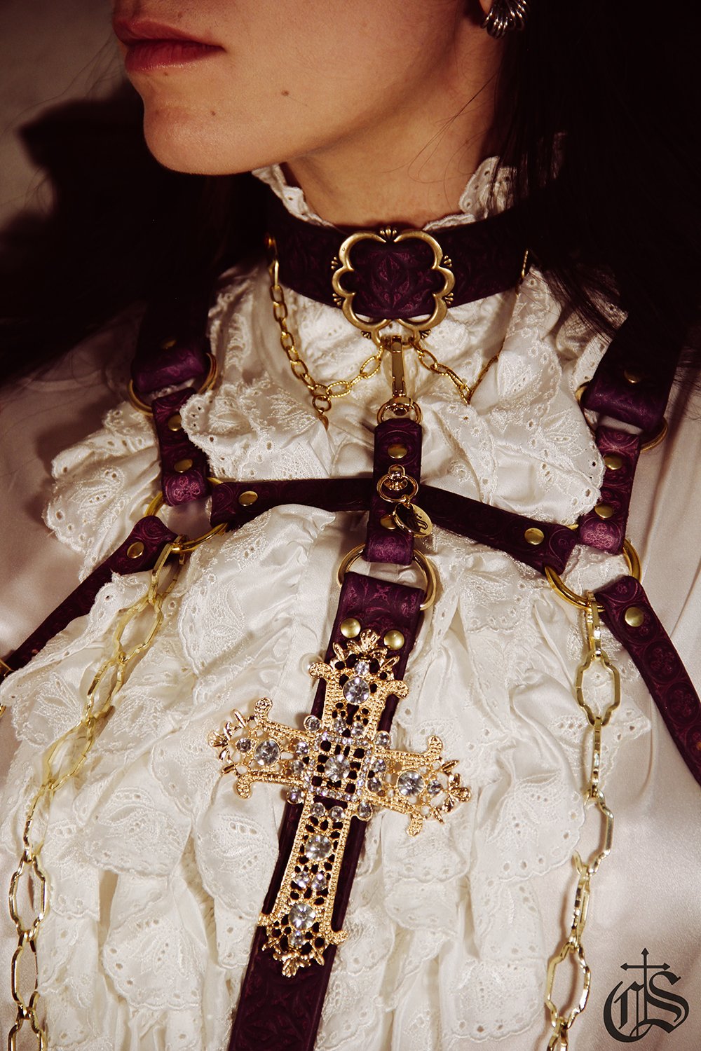 "Vicarius Chrisi" ; "Vicaire du Christ" est le surnom que l'on donne aux évêques. Hauts dignitaires de l'église, leur couleur cérémoniel est le violet, d'où la teinte des sangles composant ce harnais aux ornements riches et détaillés à la manière des ornements liturgiques de l'église catholique.