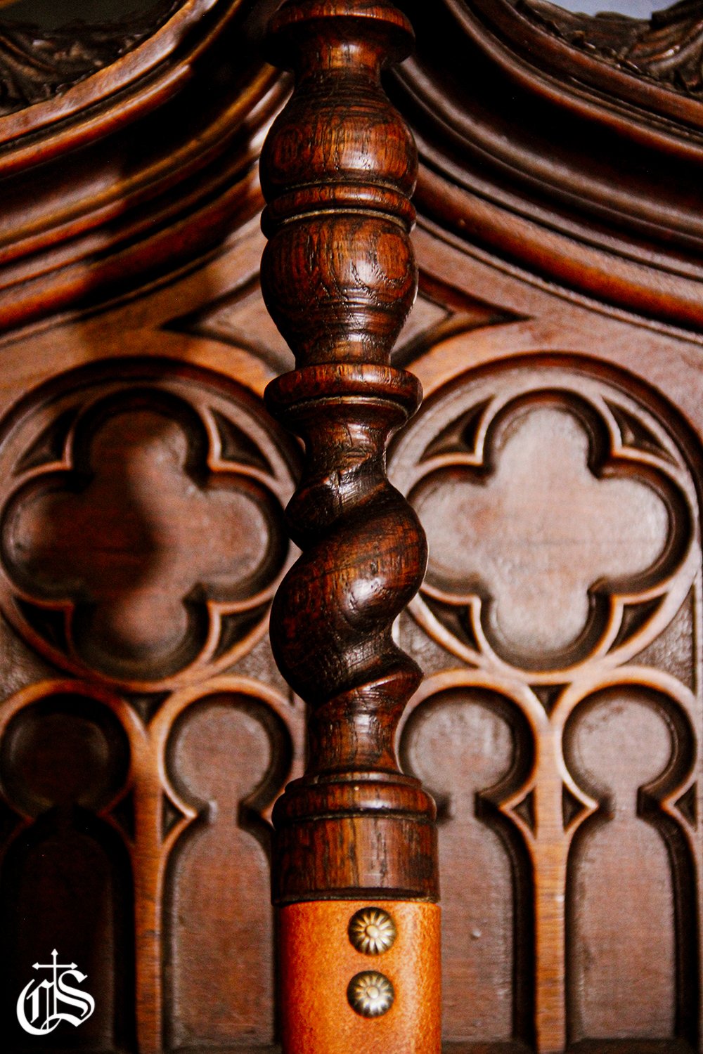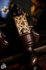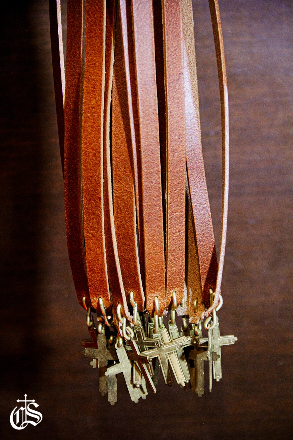 Le martinet Supplicium Crucis (le Supplice de la croix) est un accessoire de jeu imposant, avec son manche en bois massif tourné et ses 22 brins en collet refendu surmontés de croix en laiton.